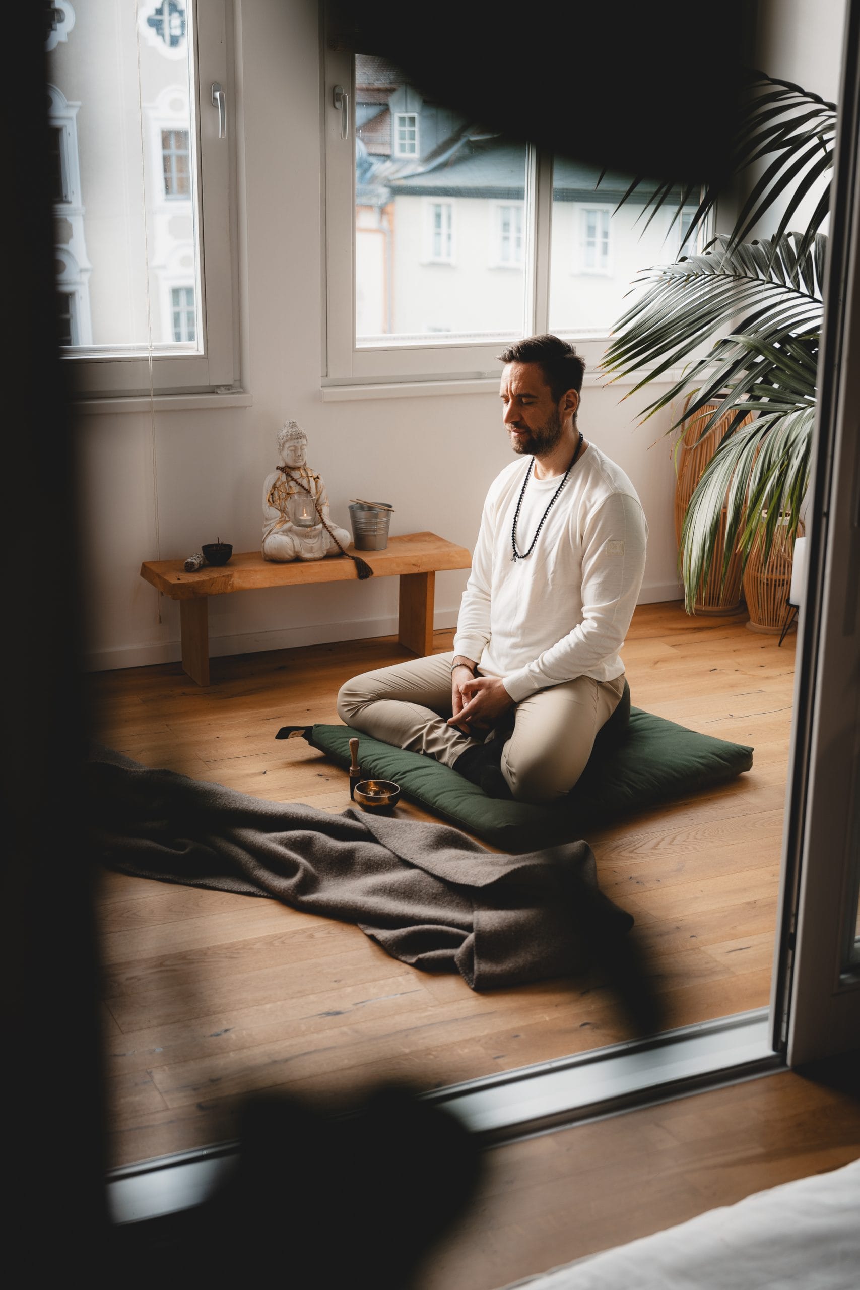 Für dieses kleine Portraitprojekt mit Peter haben wir ganz bewusst auf künstliche Lichtquellen verzichtet und stattdessen den natürlichen Sonneneinfall im Raum genutzt. Die Bilder sind in einer ruhigen, achtsamen Atmosphäre entstanden – authentisch, entspannt und mit viel Gefühl für den Moment. Zwischen Klangschale, Meditationskissen und warmem Holzboden war es mehr ein Einfangen als ein klassisches Posen.